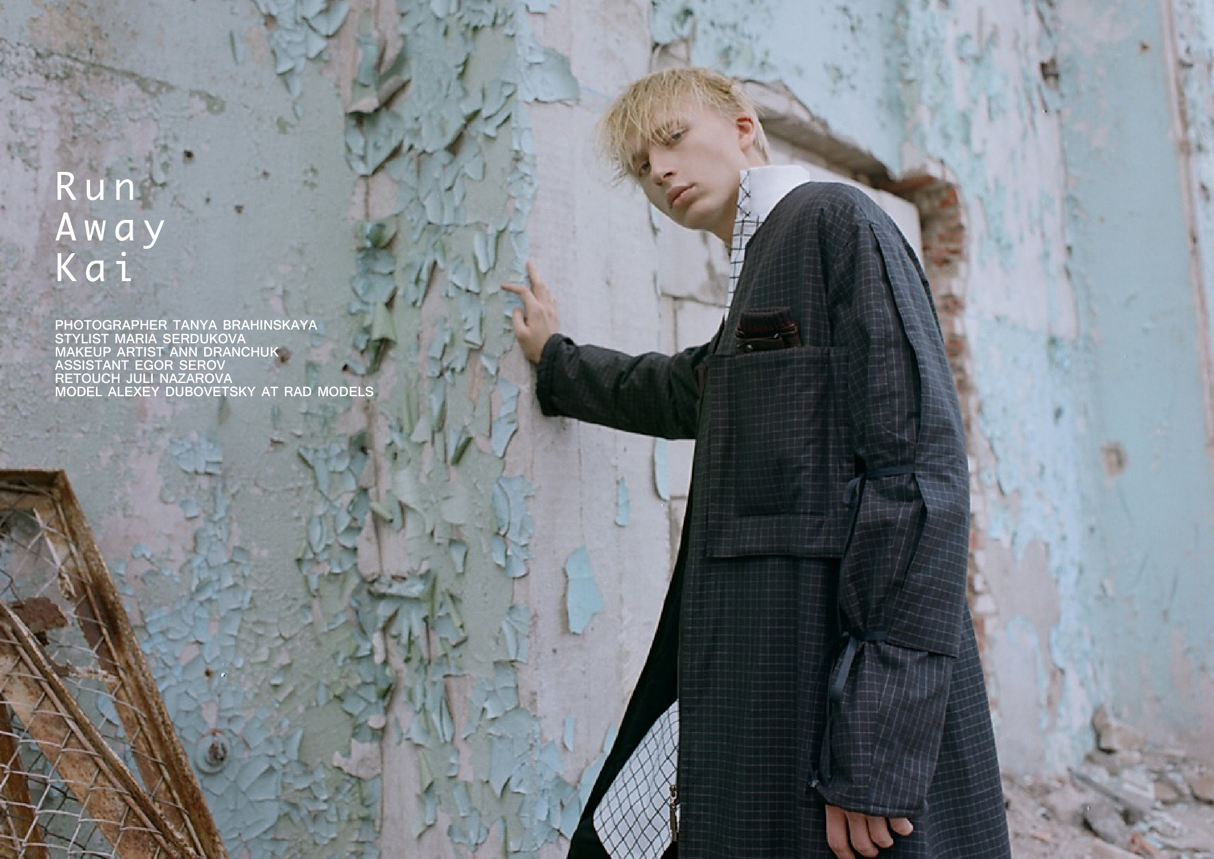 Run Away Kai features Alexey Dubovetsky at Rad Model Mgmt photographed by Belarus-based Tanya Brahinskaya and styled by Maria Serdukova for CLIENT Online. Full team credits below. Photographer Tanya Brahinskaya Stylist Maria Serdukova Makeup Artist Ann Dranchuk Assistant Egor Serov Retouch Juli N